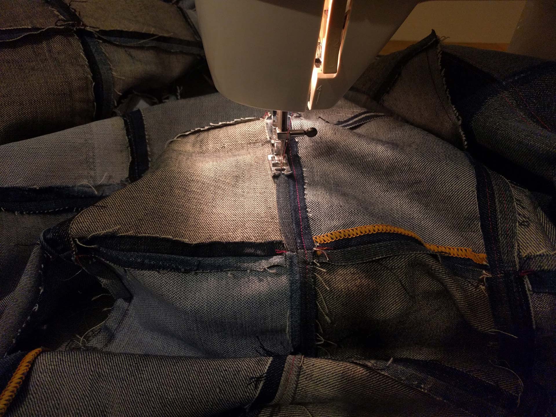It took forever to sew all the squares together, then all the rows. All of that aligning so they would be just right… Oh my, I don’t miss that part. I needed to sew down the back edges as I can’t abide the thought about putting backing on and somewhere in the middle the safety edge twists and then when you sit on it, it is all you feel!